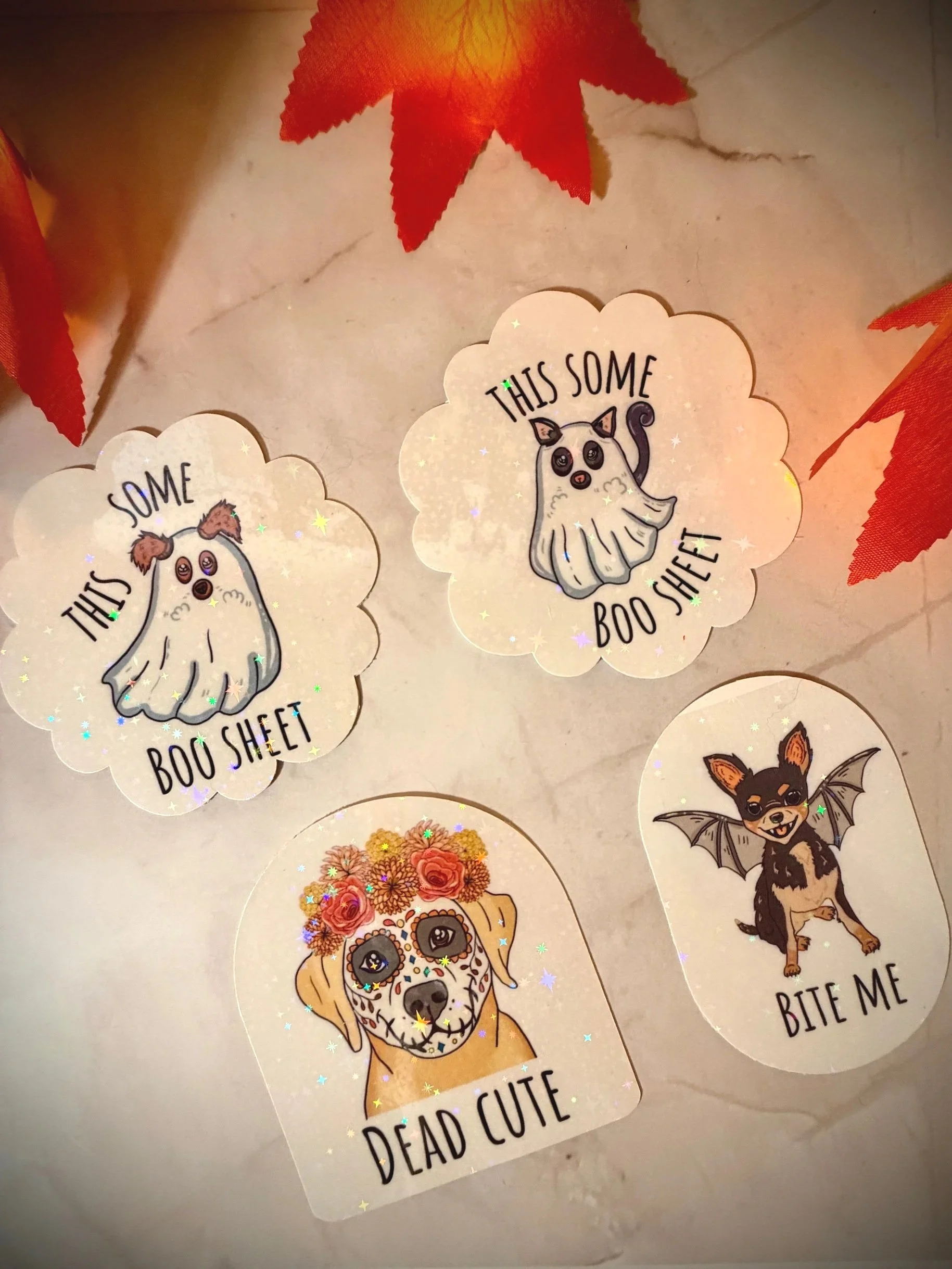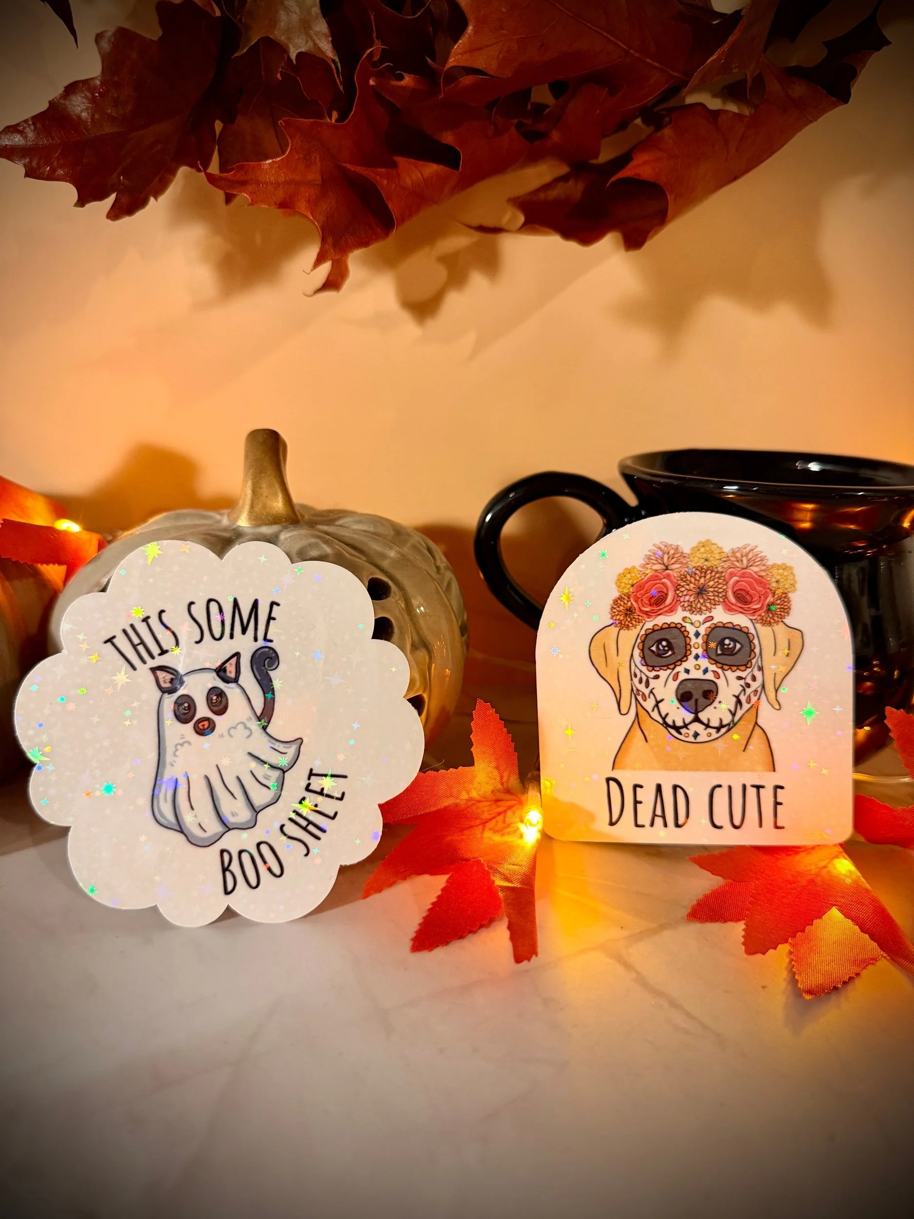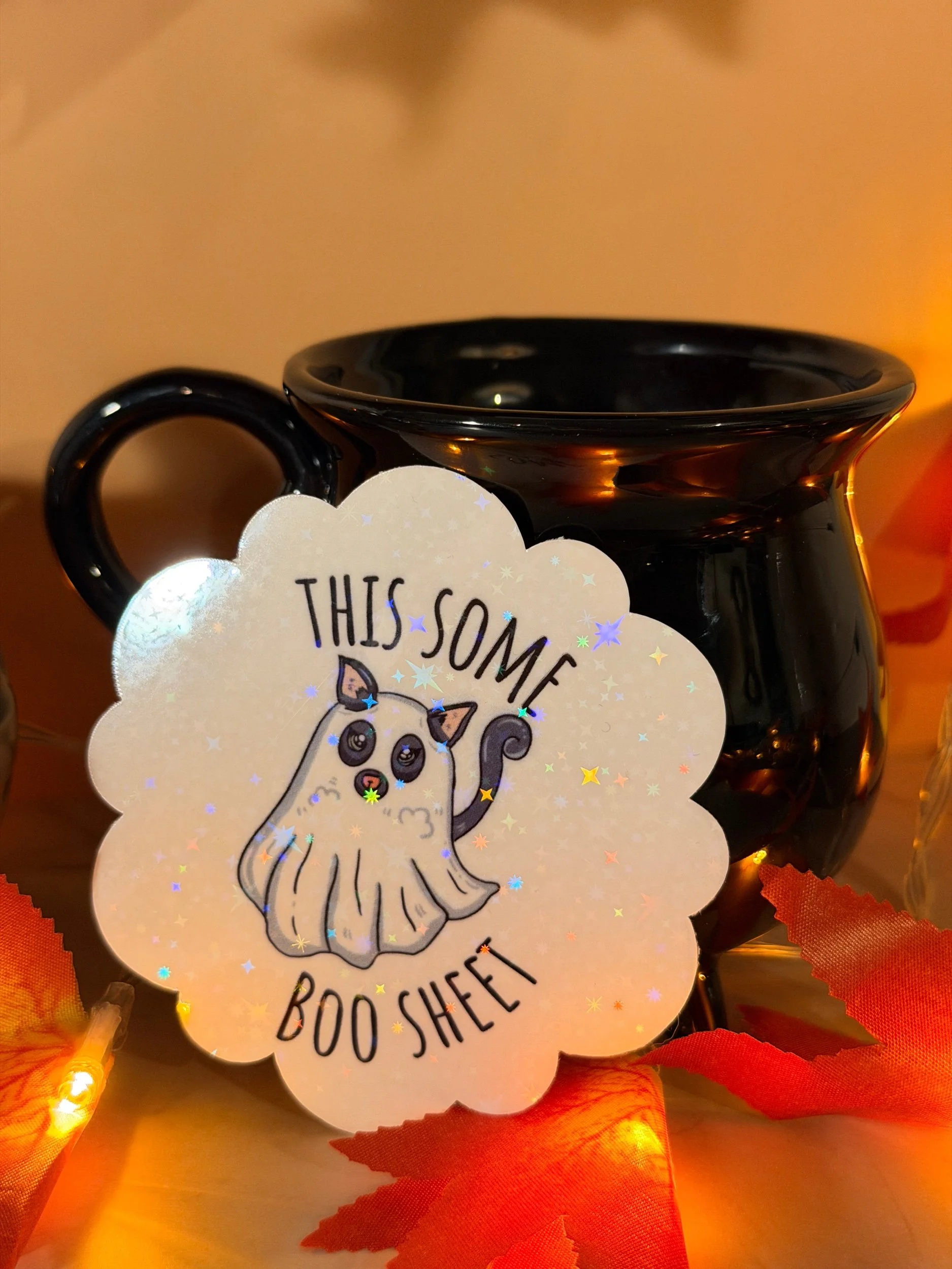 Bring sass to spooky season with this This Some Boo Sheet cat sticker! Featuring a unimpressed ghost-cat design on holographic waterproof vinyl, it’s the perfect Halloween sticker for cat lovers with a sense of humour.